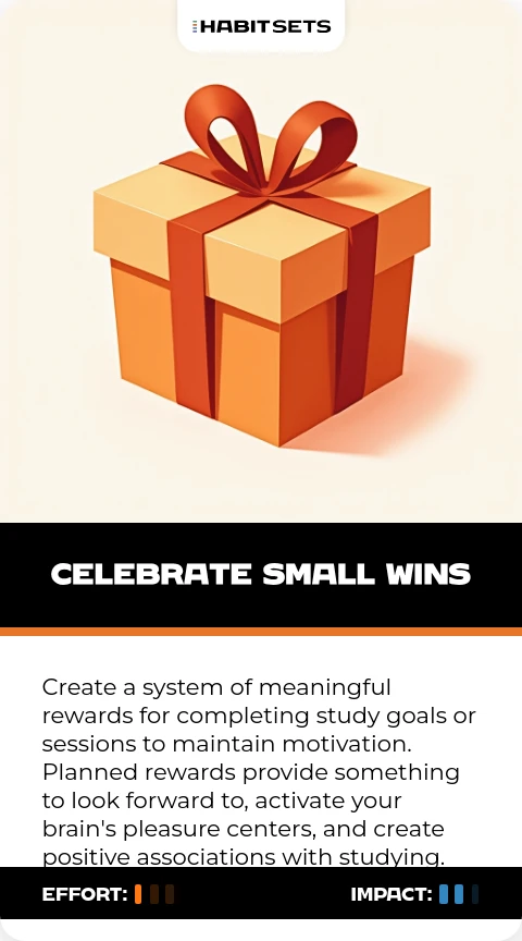 Create a system of meaningful rewards for completing study goals or sessions to maintain motivation. Planned rewards provide something to look forward to, activate your brain's pleasure centers, and create positive associations with studying.