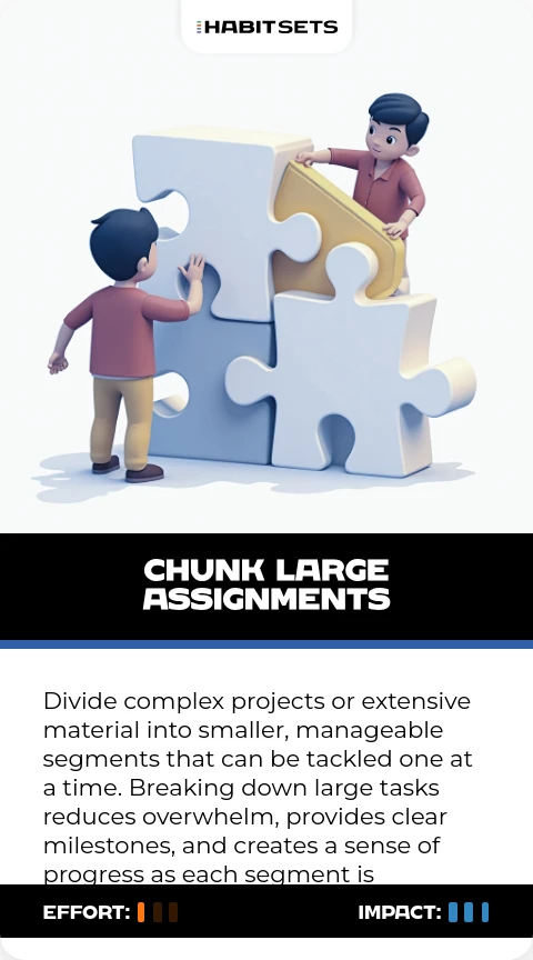 Divide complex projects or extensive material into smaller, manageable segments that can be tackled one at a time. Breaking down large tasks reduces overwhelm, provides clear milestones, and creates a sense of progress as each segment is completed.