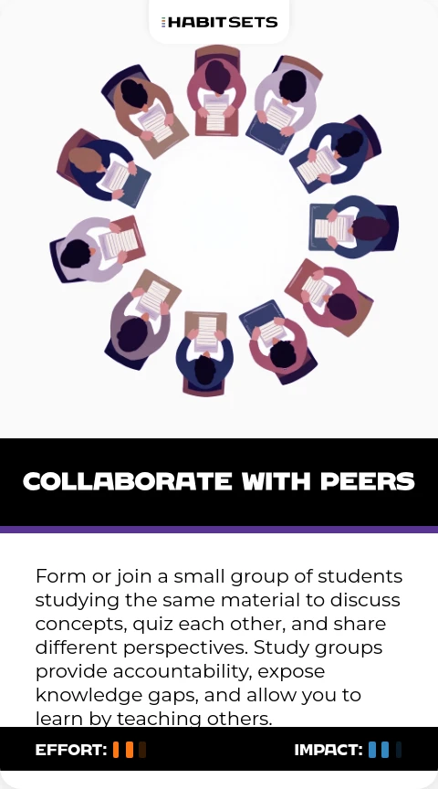 Form or join a small group of students studying the same material to discuss concepts, quiz each other, and share different perspectives. Study groups provide accountability, expose knowledge gaps, and allow you to learn by teaching others.