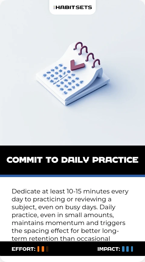 Dedicate at least 10-15 minutes every day to practicing or reviewing a subject, even on busy days. Daily practice, even in small amounts, maintains momentum and triggers the spacing effect for better long-term retention than occasional marathon sessions.