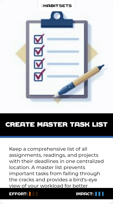 Keep a comprehensive list of all assignments, readings, and projects with their deadlines in one centralized location. A master list prevents important tasks from falling through the cracks and provides a bird's-eye view of your workload for better planning.
