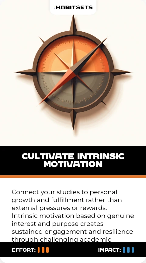 Connect your studies to personal growth and fulfillment rather than external pressures or rewards. Intrinsic motivation based on genuine interest and purpose creates sustained engagement and resilience through challenging academic periods.
