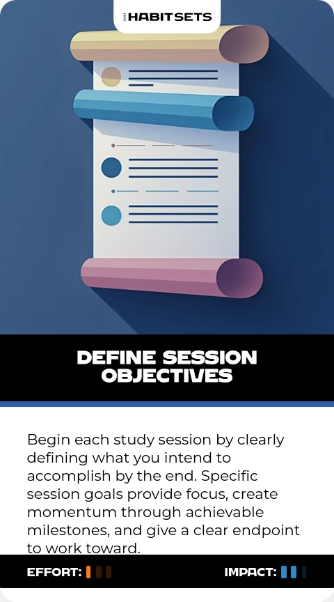 Begin each study session by clearly defining what you intend to accomplish by the end. Specific session goals provide focus, create momentum through achievable milestones, and give a clear endpoint to work toward.