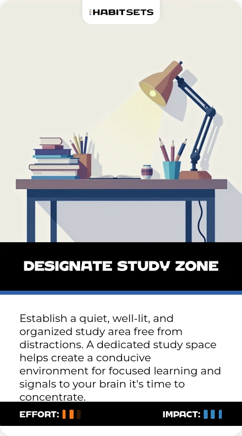 Establish a quiet, well-lit, and organized study area free from distractions. A dedicated study space helps create a conducive environment for focused learning and signals to your brain it's time to concentrate.
