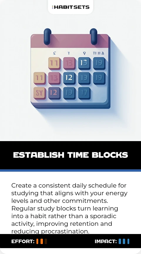 Create a consistent daily schedule for studying that aligns with your energy levels and other commitments. Regular study blocks turn learning into a habit rather than a sporadic activity, improving retention and reducing procrastination.