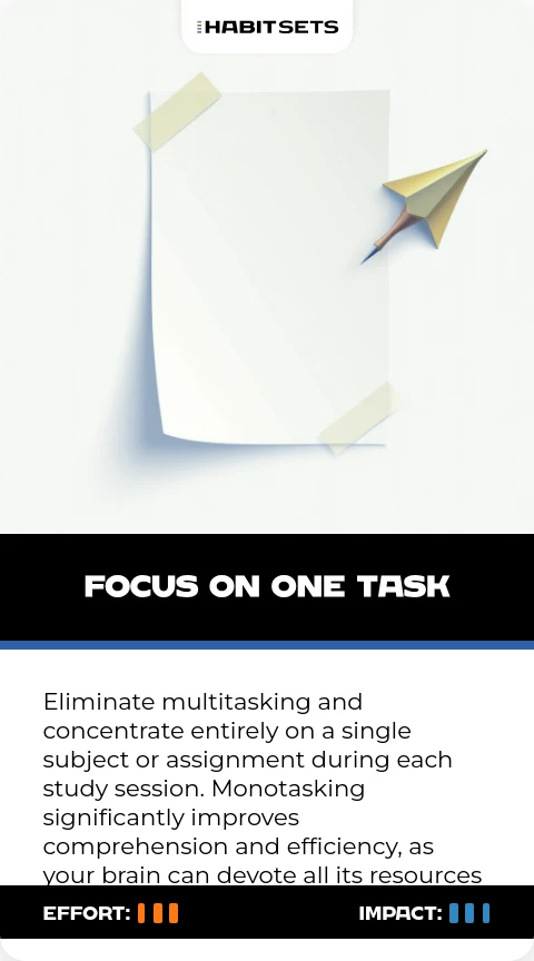Eliminate multitasking and concentrate entirely on a single subject or assignment during each study session. Monotasking significantly improves comprehension and efficiency, as your brain can devote all its resources to one learning objective.