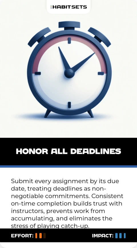 Submit every assignment by its due date, treating deadlines as non-negotiable commitments. Consistent on-time completion builds trust with instructors, prevents work from accumulating, and eliminates the stress of playing catch-up.