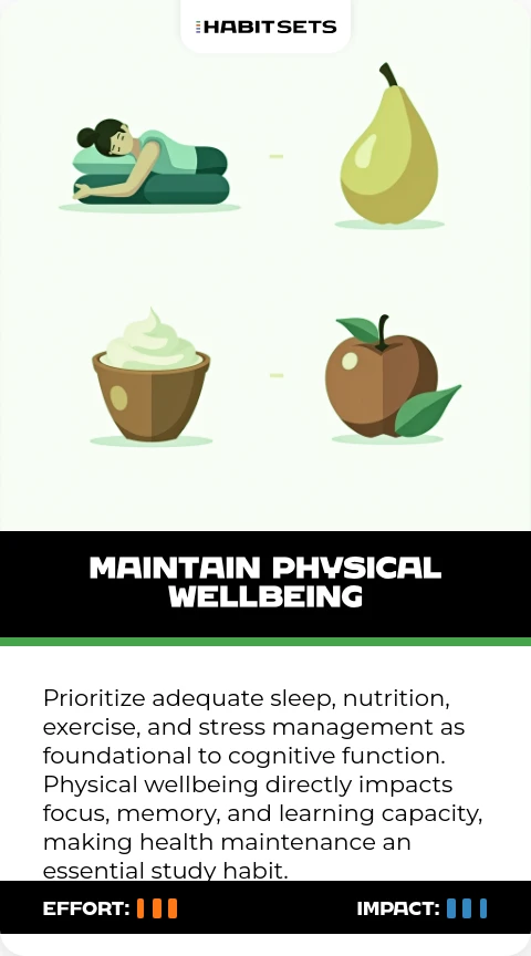 Prioritize adequate sleep, nutrition, exercise, and stress management as foundational to cognitive function. Physical wellbeing directly impacts focus, memory, and learning capacity, making health maintenance an essential study habit.