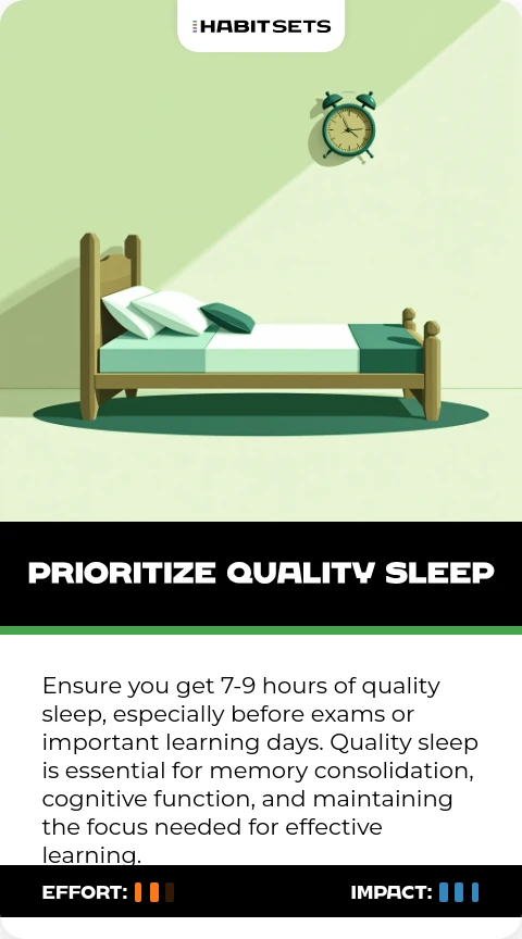 Ensure you get 7-9 hours of quality sleep, especially before exams or important learning days. Quality sleep is essential for memory consolidation, cognitive function, and maintaining the focus needed for effective learning.