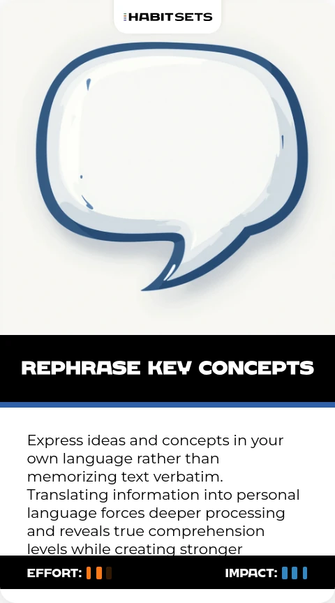 Express ideas and concepts in your own language rather than memorizing text verbatim. Translating information into personal language forces deeper processing and reveals true comprehension levels while creating stronger memory connections.