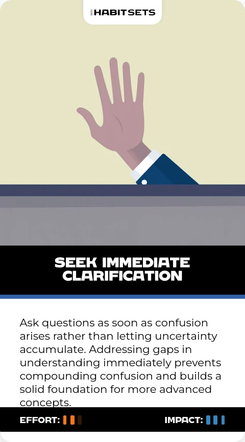 Ask questions as soon as confusion arises rather than letting uncertainty accumulate. Addressing gaps in understanding immediately prevents compounding confusion and builds a solid foundation for more advanced concepts.