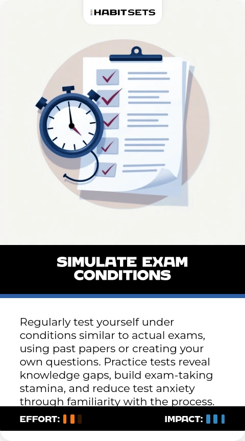 Regularly test yourself under conditions similar to actual exams, using past papers or creating your own questions. Practice tests reveal knowledge gaps, build exam-taking stamina, and reduce test anxiety through familiarity with the process.