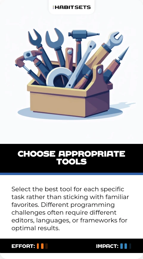 Select the best tool for each specific task rather than sticking with familiar favorites. Different programming challenges often require different editors, languages, or frameworks for optimal results.