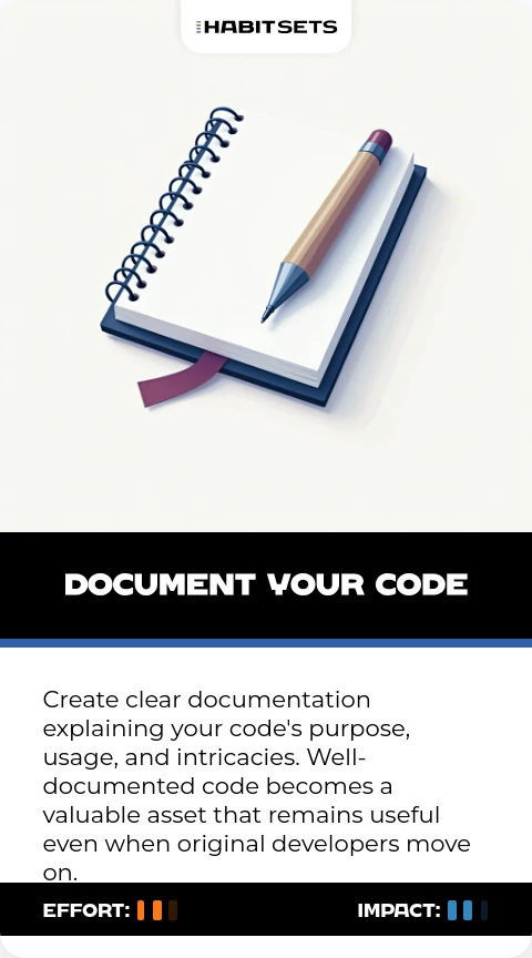 Create clear documentation explaining your code's purpose, usage, and intricacies. Well-documented code becomes a valuable asset that remains useful even when original developers move on.