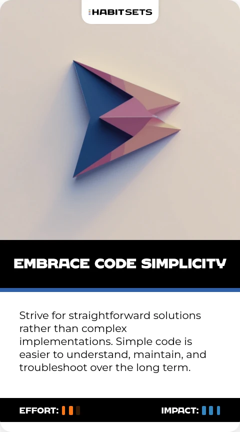 Strive for straightforward solutions rather than complex implementations. Simple code is easier to understand, maintain, and troubleshoot over the long term.