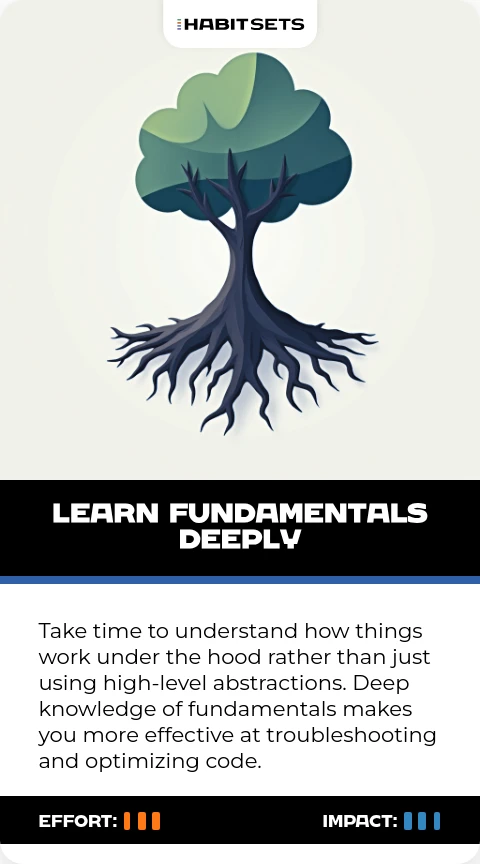 Take time to understand how things work under the hood rather than just using high-level abstractions. Deep knowledge of fundamentals makes you more effective at troubleshooting and optimizing code.