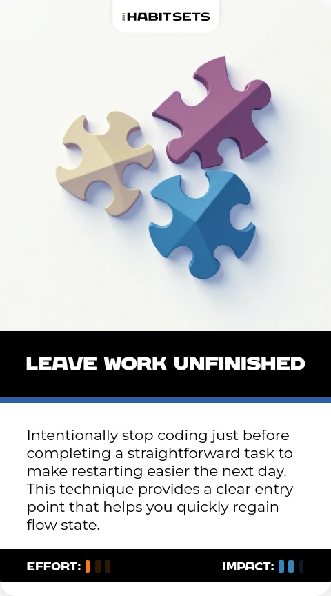 According to Engineers Codex, leaving work slightly unfinished helps you reach flow state more easily when you return. The author found that having a clear starting point eliminates the initial friction that often prevents developers from resuming productive work quickly.