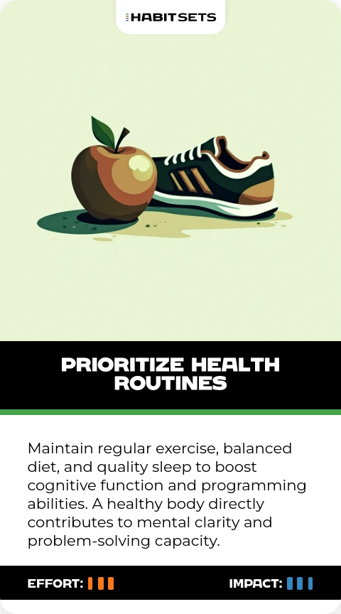 Maintain regular exercise, balanced diet, and quality sleep to boost cognitive function and programming abilities. A healthy body directly contributes to mental clarity and problem-solving capacity.