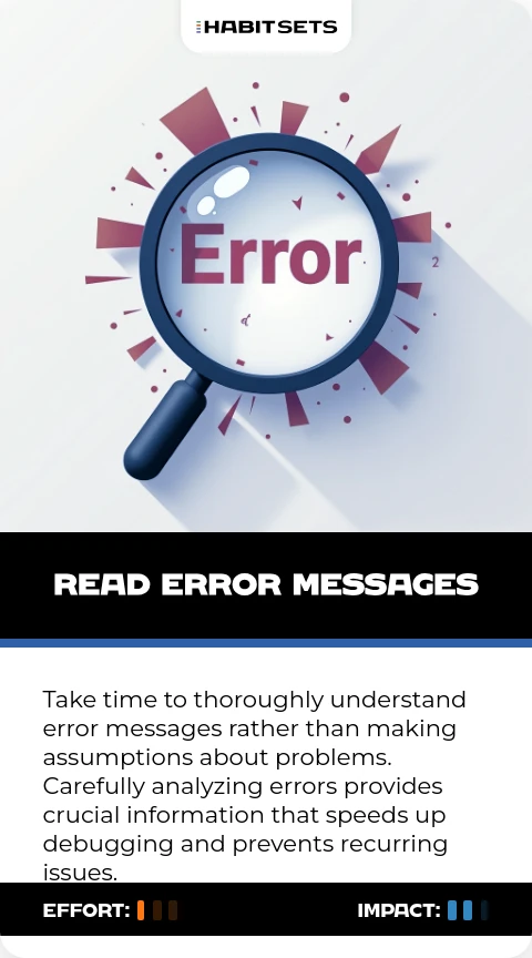 Take time to thoroughly understand error messages rather than making assumptions about problems. Carefully analyzing errors provides crucial information that speeds up debugging and prevents recurring issues.
