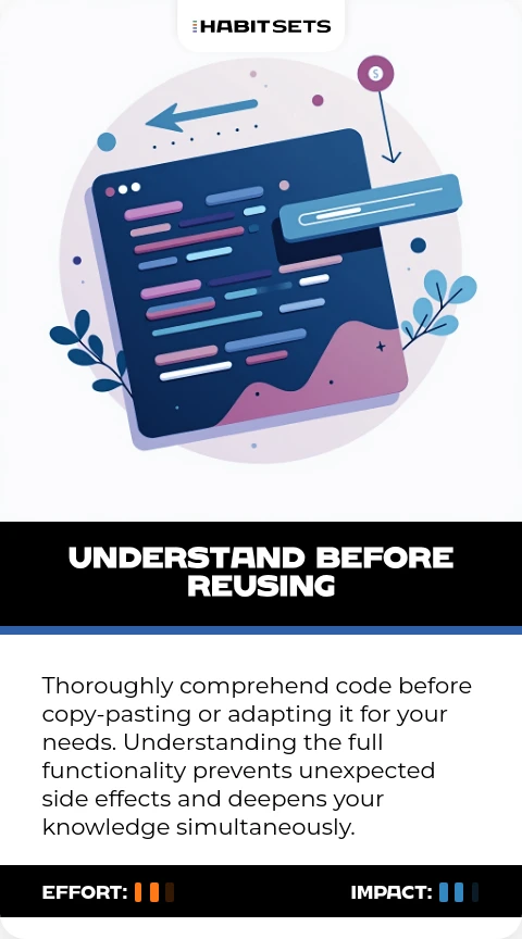 Thoroughly comprehend code before copy-pasting or adapting it for your needs. Understanding the full functionality prevents unexpected side effects and deepens your knowledge simultaneously.