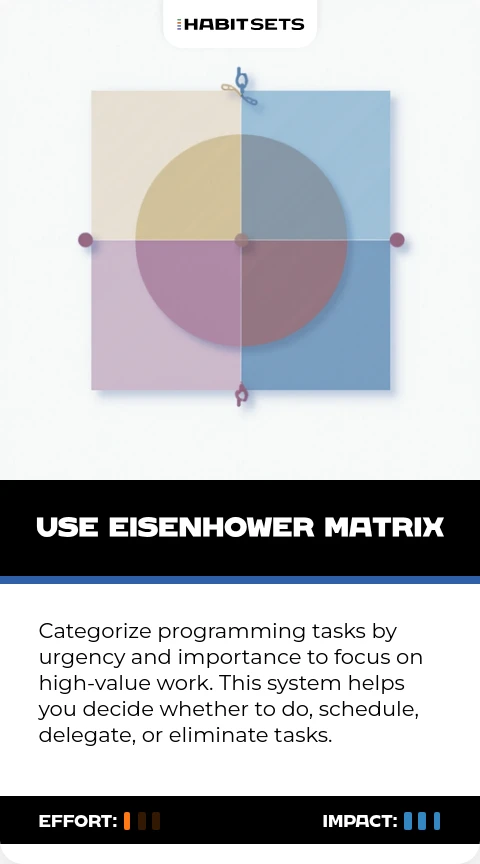 Categorize programming tasks by urgency and importance to focus on high-value work. This system helps you decide whether to do, schedule, delegate, or eliminate tasks.