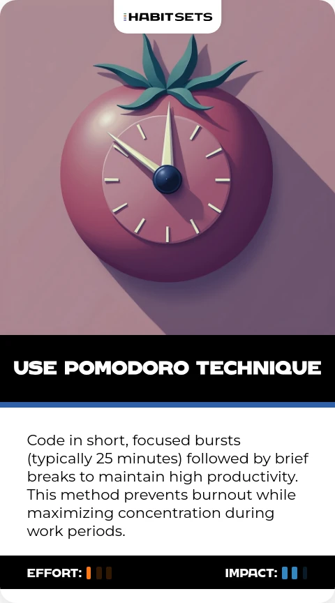 Code in short, focused bursts (typically 25 minutes) followed by brief breaks to maintain high productivity. This method prevents burnout while maximizing concentration during work periods.
