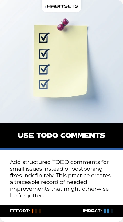 Add structured TODO comments for small issues instead of postponing fixes indefinitely. This practice creates a traceable record of needed improvements that might otherwise be forgotten.