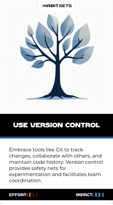 Embrace tools like Git to track changes, collaborate with others, and maintain code history. Version control provides safety nets for experimentation and facilitates team coordination.