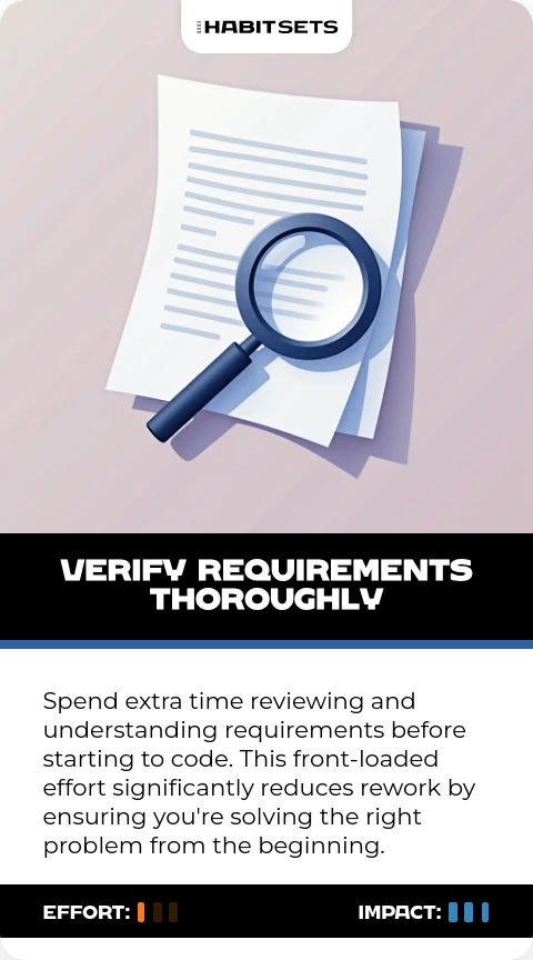 Spend extra time reviewing and understanding requirements before starting to code. This front-loaded effort significantly reduces rework by ensuring you're solving the right problem from the beginning.