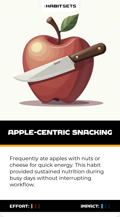 Frequently ate apples with nuts or cheese for quick energy. This habit provided sustained nutrition during busy days without interrupting workflow.