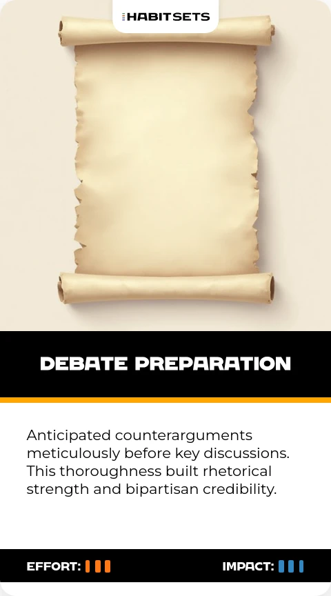 Anticipated counterarguments meticulously before key discussions. This thoroughness built rhetorical strength and bipartisan credibility.