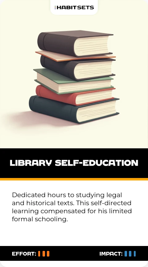 Dedicated hours to studying legal and historical texts. This self-directed learning compensated for his limited formal schooling.