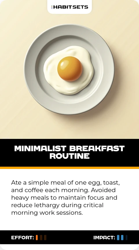 - Efficiency: Simplify routines, like meals, to minimize distractions and maximize productivity, as seen in his minimalist breakfast.