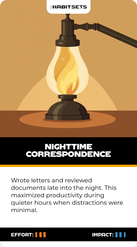 Wrote letters and reviewed documents late into the night. This maximized productivity during quieter hours when distractions were minimal.