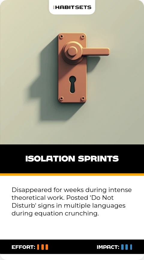 Disappeared for weeks during intense theoretical work. Posted 'Do Not Disturb' signs in multiple languages during equation crunching.