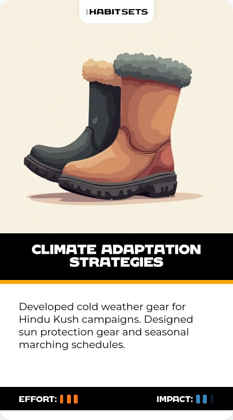 Developed cold weather gear for Hindu Kush campaigns. Designed sun protection gear and seasonal marching schedules.