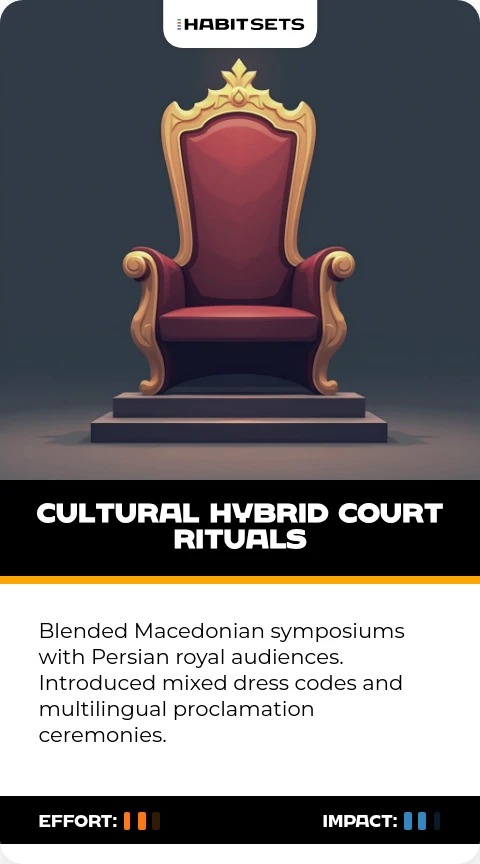 Blended Macedonian symposiums with Persian royal audiences. Introduced mixed dress codes and multilingual proclamation ceremonies.