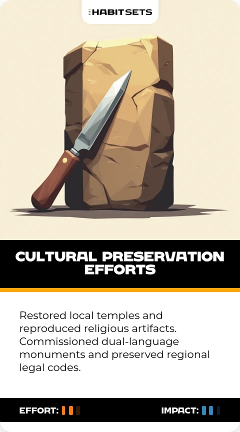 Restored local temples and reproduced religious artifacts. Commissioned dual-language monuments and preserved regional legal codes.