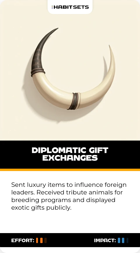 Sent luxury items to influence foreign leaders. Received tribute animals for breeding programs and displayed exotic gifts publicly.