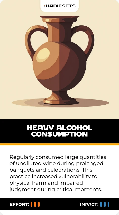 Regularly consumed large quantities of undiluted wine during prolonged banquets and celebrations. This practice increased vulnerability to physical harm and impaired judgment during critical moments.