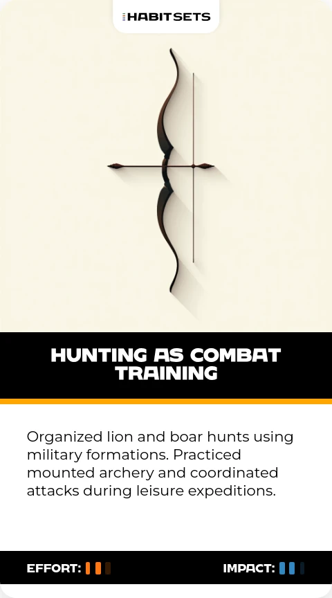 Organized lion and boar hunts using military formations. Practiced mounted archery and coordinated attacks during leisure expeditions.