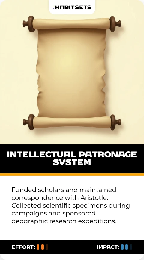 Funded scholars and maintained correspondence with Aristotle. Collected scientific specimens during campaigns and sponsored geographic research expeditions.