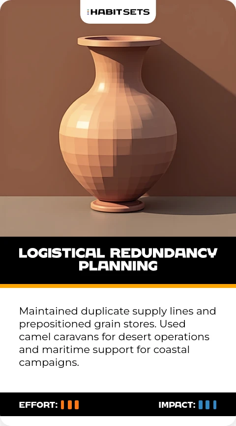 Maintained duplicate supply lines and prepositioned grain stores. Used camel caravans for desert operations and maritime support for coastal campaigns.