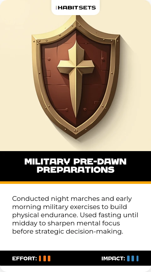 Conducted night marches and early morning military exercises to build physical endurance. Used fasting until midday to sharpen mental focus before strategic decision-making.