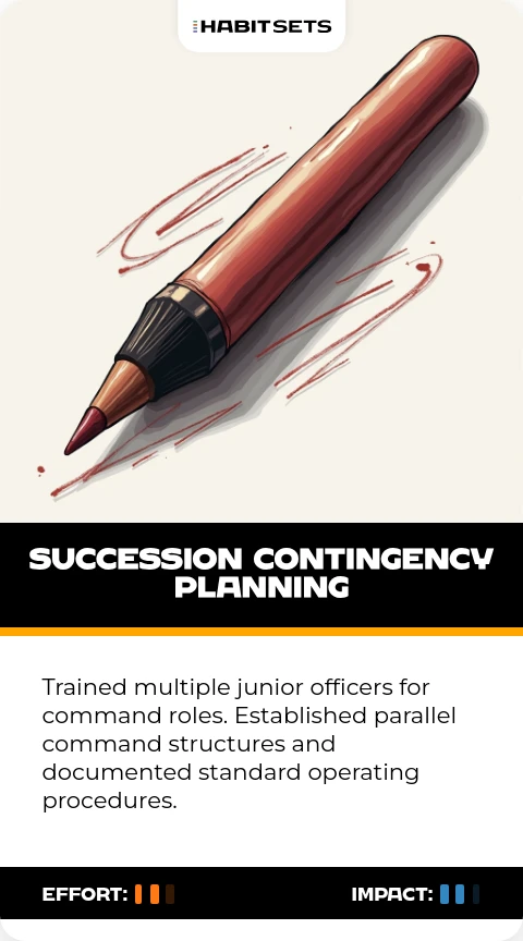 Trained multiple junior officers for command roles. Established parallel command structures and documented standard operating procedures.