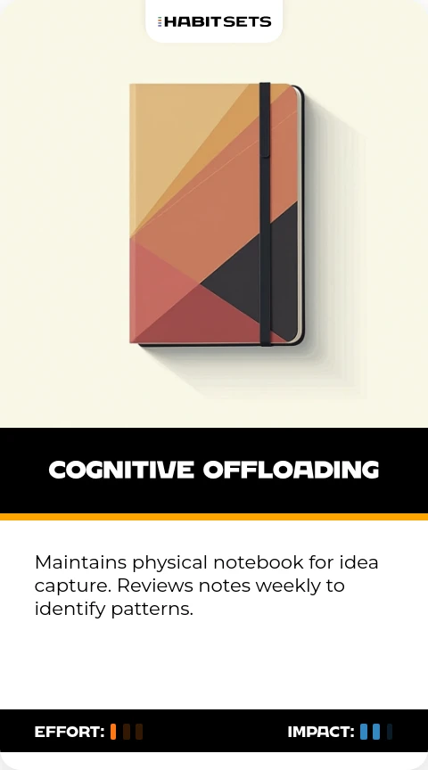 Maintains physical notebook for idea capture. Reviews notes weekly to identify patterns.