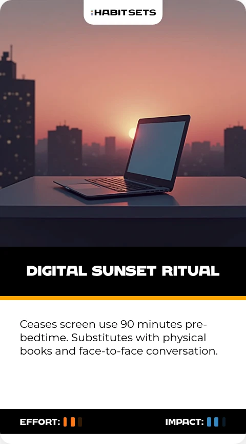 Ceases screen use 90 minutes pre-bedtime. Substitutes with physical books and face-to-face conversation.