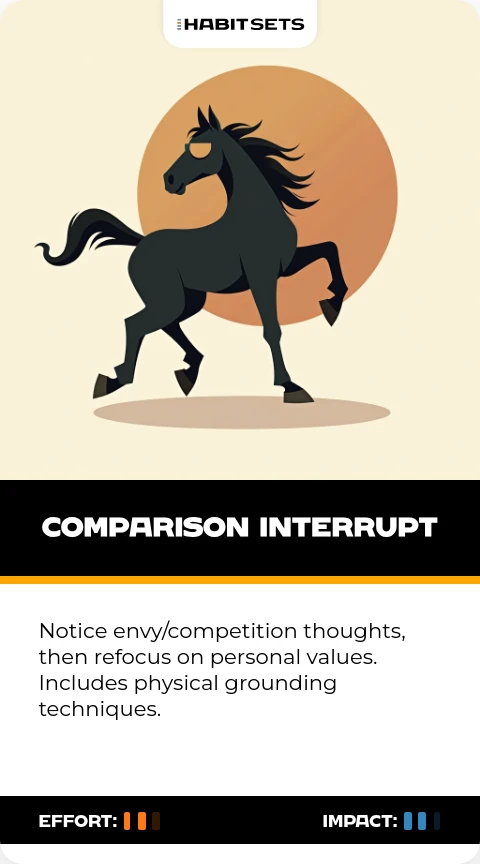 Notice envy/competition thoughts, then refocus on personal values. Includes physical grounding techniques.