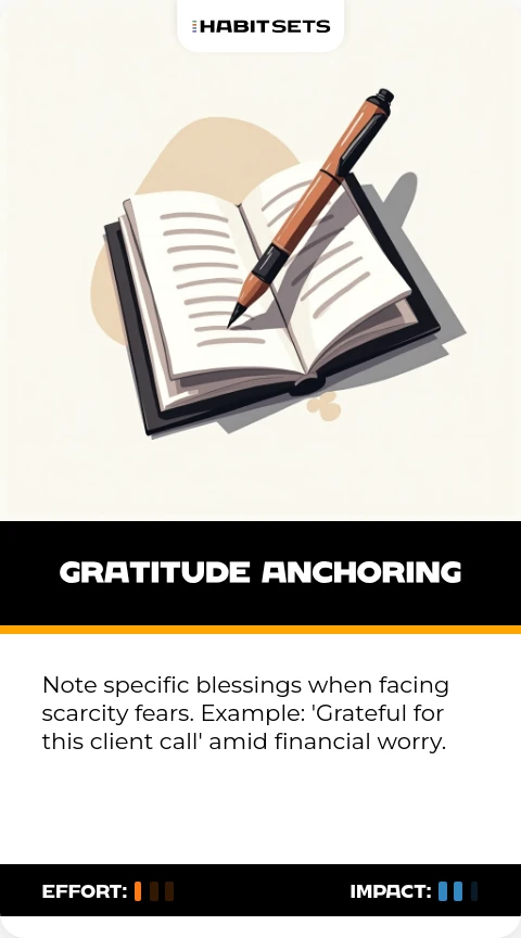 Note specific blessings when facing scarcity fears. Example: 'Grateful for this client call' amid financial worry.