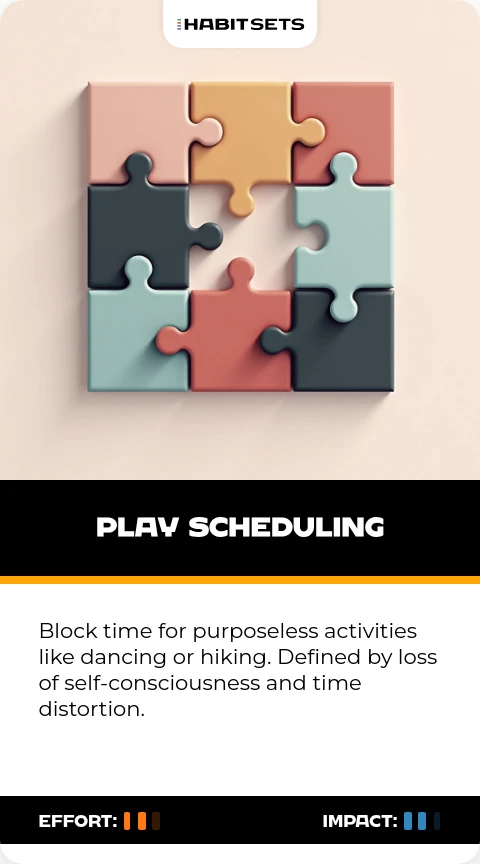 Block time for purposeless activities like dancing or hiking. Defined by loss of self-consciousness and time distortion.
